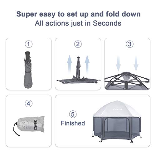[Zelfopblaasbare matras en UV Shade Cover] – Deze Pop ‘N Go bevat zelfopblaasbare matras die een veilig en comfortabel speelstation voor baby’s en ouders kan creëren en peuter kan beschermen wanneer hij naar beneden valt. Met 6 klittenband anti UV luifel kan de box uw baby’s beschermen tegen ongedierte en zonnebrand. Ook zult u zich geen zorgen maken dat de hoes wordt weggeblazen door de wind.