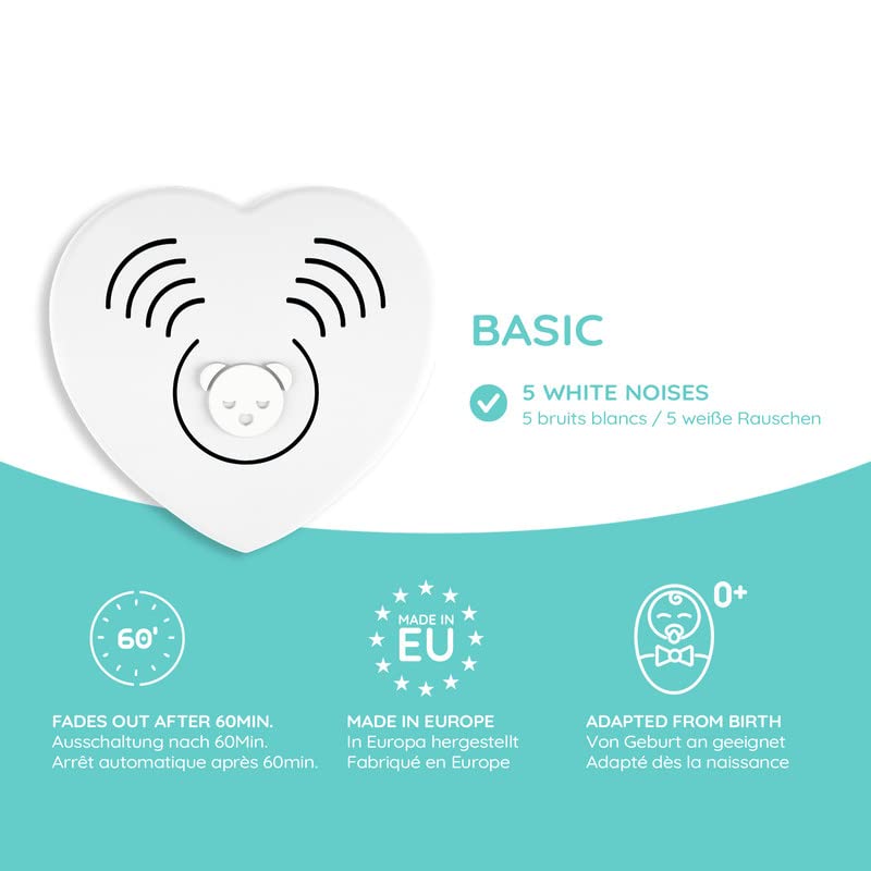 Rustgevende geluiden voor beter slapen: kies uit in totaal 5 geluiden: witte ruis – roze ruis – zeeruis – knapperende regen – moederlijfgeluid met hartslag.