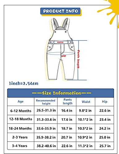 Deze denim overall is geschikt voor 6-12 maanden, 12-18 maanden, 18-24 maanden, 2-3 jaar, 3-4 jaar, 4-5 jaar, peuter klein kind