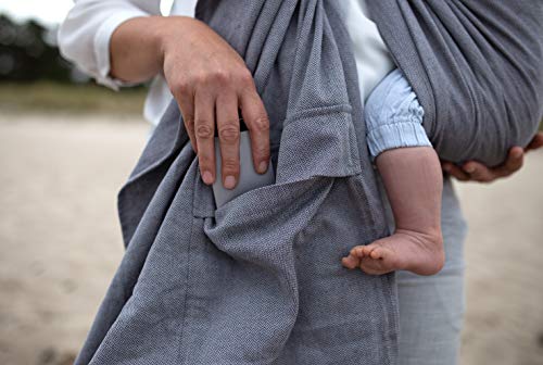 De ring Sling is een draagdoek die je met metalen ringen en zonder knopen vasthoudt