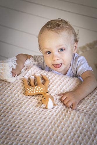 Het eerste hert gemaakt van 100% natuurlijk rubber van de Hevea-boom en behandeld met vernis die wordt gebruikt in de voedingsindustrie. Dit betekent dat FanFan absoluut vrij is van schadelijke stoffen zoals PVC, ftalaten, BPA en andere weekmakers, kortom een veilig en duurzaam speelgoed. FanFan kan door baby’s gemakkelijk met hun kleine handjes worden vastgepakt. Hun donkere kleur en lichte vlekken trekken door het contrast de aandacht van de baby en zorgen ervoor dat de baby ze herkent. Omdat FanFan is gemaakt van natuurlijk rubber, heeft het een speciale geur waardoor het voor de baby gemakkelijk te herkennen is tussen al het speelgoed. De subtiele pieptoon stimuleert het gehoor en laat de baby kennismaken met oorzaak en gevolg. En als de baby tandjes krijgt, zorgen de oren en lange benen voor verlichting door te zuigen en te bijten. Dit product bevat 1x Sophie The Giraffe – Bijtspeeltje – Fan Fan The Deer – 1 stuk