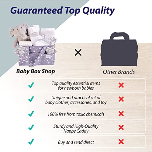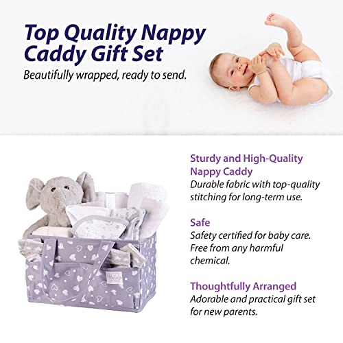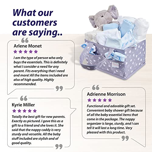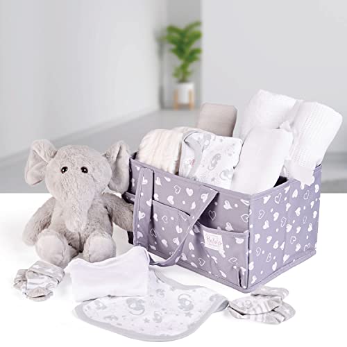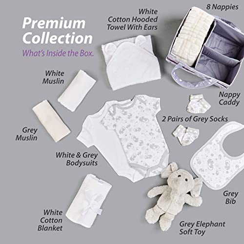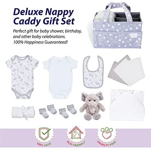 Unieke Baby Gift Set – Leuke, stijlvolle en functionele luier caddy set. Deze unieke en nuttige collectie bestaat uit 8 luiers, 1 witte katoenen handdoek met capuchon met oren, 1 witte bodysuit, 1 grijze bodysuit, 1 grijs slabbetje, 2 grijze mousseline, 1 witte katoenen deken, 2 paar grijze sokken en een grijs olifant zacht speelgoed. Essentiële babyverlanglijst moet hebben!